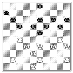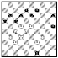 Tom Swelsen werd de schjlemiel van de dag. Louis de Frankrijker had in onderstaande diagramstand zojuist een dam gehaald. Gedesillusioneerd gaf Tom de strijd op om even later tot de ontdekking te komen dat de voor de hand liggende afwikkeling die wordt ingeleid door 23-18 tot remise leidt.